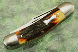 The handle is formed from amber stag scales set on a stainless steel frame using pins. A queen chess piece escutcheon is flawlessly inlaid into the left handle scale. Front and rear bolsters are made from polished 416 stainless steel. The liners have been jewel polished on the interior and hand fileworked. The tapered backbar is hand engraved with a running wheat pattern. Creating the running wheat on a tapered surface is extremely difficult and shows Ruple's engraving skills at their best.