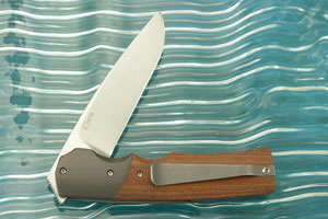 The handle is made from natural micarta perfectly fit to stonewashed titanium bolsters. Titanium liners are stonewashed and surround polished back spacer. The matching stonewashed titanium pocket clip is mounted for right-handed, tip-up carry.