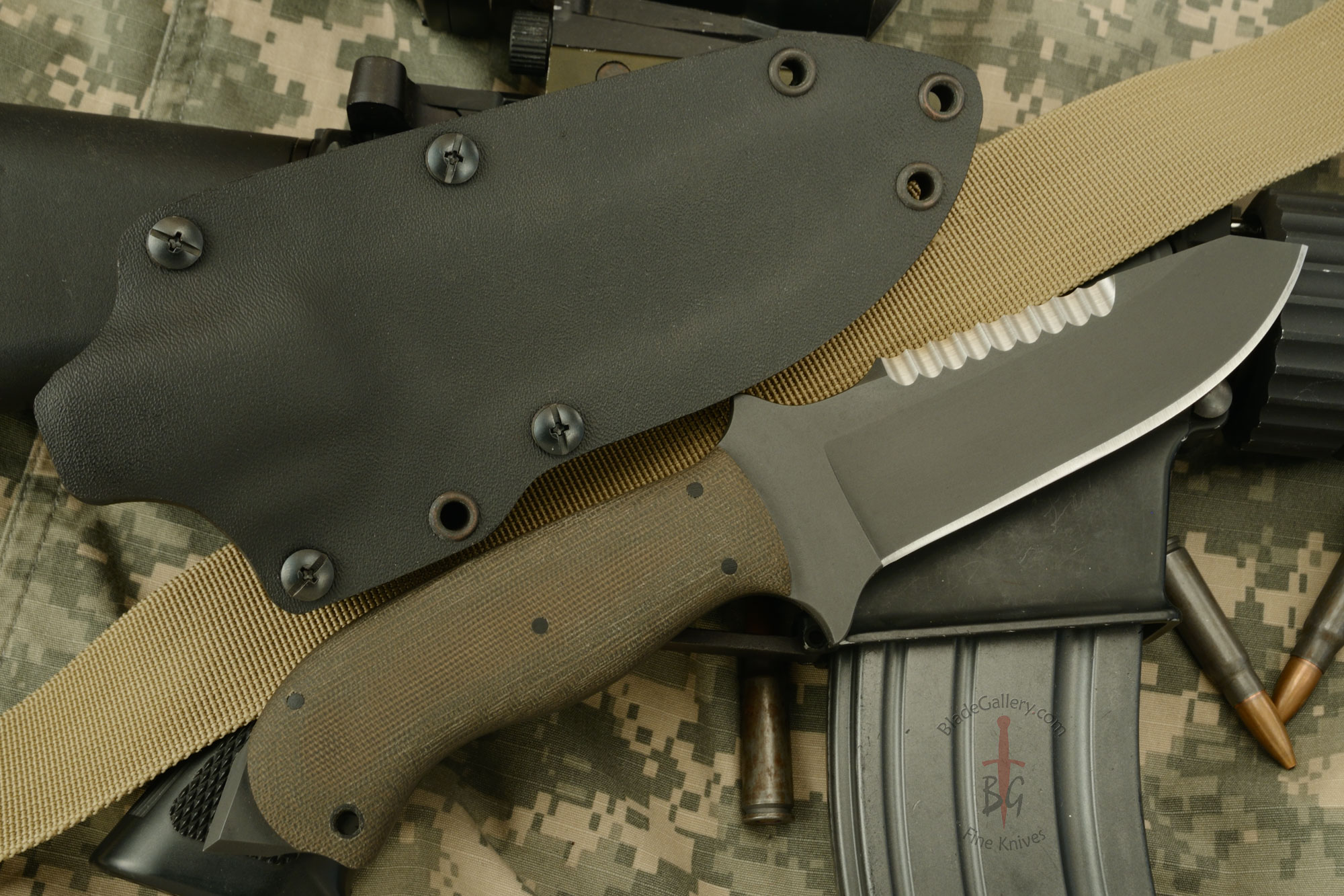Truly a multi-tasker, the S.A.R was developed at the request of a municipal Search and Rescue Team. It is a combination of the WKII Utility Knife and the WKII Spike. Serrations along the spine knife provide fiber cutting capabilities without giving up any of the cutting edge. The horizontal cross guard is an added safe guard. There is an effective glass breaker at the butt of the handle. This knife is made of 80CrV2 carbon steel with a non-reflective Caswell finish.