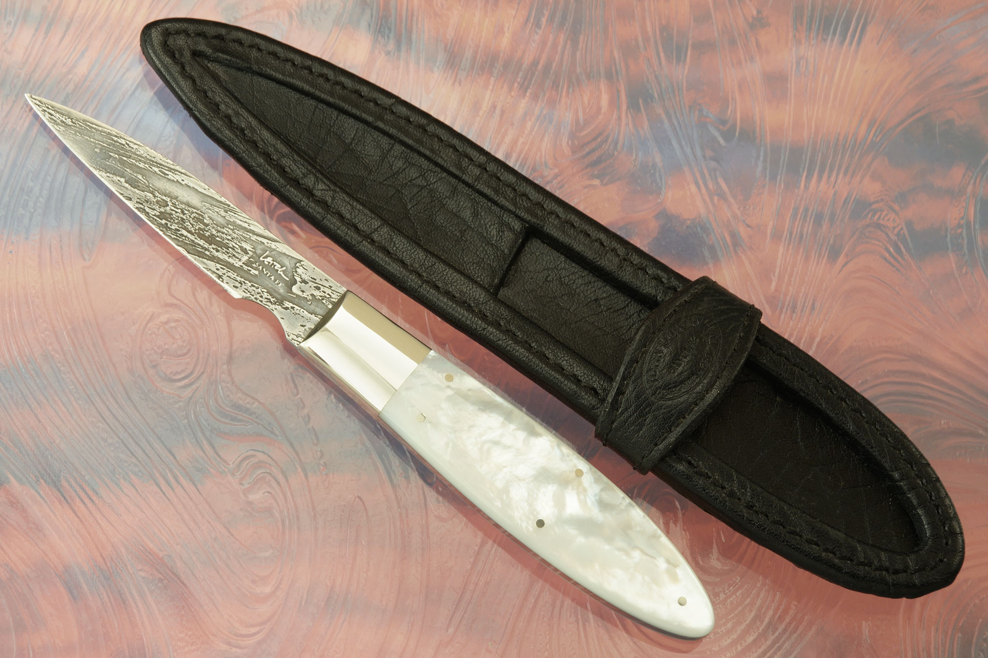 Premium whitelip mother of pearl handle scales are set on the full tang for strenght and durability. The fit between nickel silver bolsters and the scales is excellent.