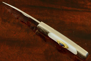 Front and rear bolsters are perfectly fit to premium whitelip mother of pearl handle scales. The bolsters were hand scroll engraved, one knife at a time, by Rex Pedersen, a longtime member of the Engravers Guild of America. An 18k gold art nouveau style casting was inlaid with a purple star sapphire.