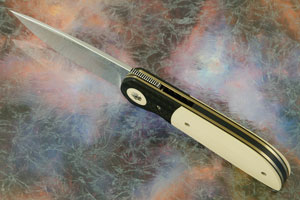 The handle combines antique Westinghouse Micarta with stacked black G10/carbon fiber bolsters. This Micarta was developed in 1910 by Westinghouse Electric Corporation as an industrial thermo-set laminate for electrical insulation. This light toned Micarta was lost in a warehouse and only recently discovered. A matching Westinghouse Micarta pivot collar surrounds the custom pivot. Black G-10 liners add an elegant contrast. Bronze anodized titanium liners surround a black carbon fiber back spacer. A bronze anodized, orange peel textured titanium pocket clip is mounted for right-handed, tip-up carry.