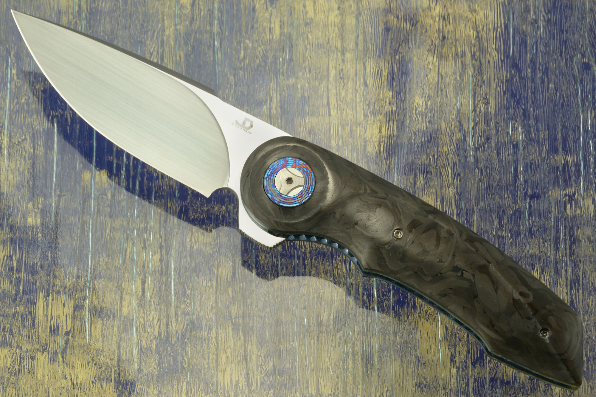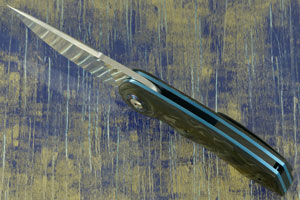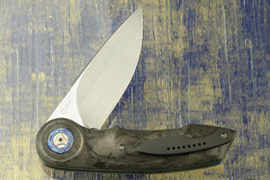 The scales are contoured marble carbon fiber. A terraced titanium damascus (Black Timascus) pivot ring surrounds the pivot. Blue anodized titanium liners and a carbon fiber backbar keep the knife light, yet strong. The blackened titanium pocket clip is mounted for right-side, tip-up carry.