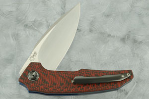Handle scales are formed from red/black carbon fiber. Jimping on the thumb ramp aids grip. The gently rounded handle feels sturdy and fills out hand perfectly. The custom pivot is heat colored zirconium and is surrounded by a matching zirconium pivot collar. The handle is completed with blue anodized titanium liners. The 3D machined zirconium pocket clip is mounted for tip-up, right handed carry.