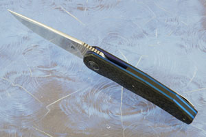 Handle scales are formed from carbon fiber. Jimping on the thumb ramp aids grip. The gently rounded handle feels sturdy and fills the hand perfectly. The backbar is made from matching carbon fiber. The custom pivot and collar are made from zirconium. The handle is completed with blue anodized titanium liners. The ultra-light titanium pocket clip is mounted for tip-up, right-handed carry.