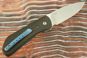 Handle scales are made from carbon fiber. The titanium liners and pocket clip are textured and anodized blue. A carbon fiber back spacer keeps the knife strong yet light. The pocket clip is mounted right-handed, tip-up carry.