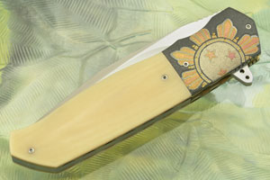 Handle scales are formed from bone Micarta. Jimping on the thumb ramp provides a comfortable, secure grip. The gently rounded handle feels sturdy and fills the hand perfectly. This combination nicely complements anodized and engraved zirconium bolsters. The bolsters have an elegant iridescence that is captivating. Zirconium is a transitional metal that is primarily mined in South Africa and Australia. It is highly resistant to corrosion. The handle is completed with anodized titanium liners. The 3D machined titanium pocket clip with ceramic retention ball is mounted for right-handed, tip-up carry.