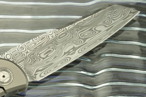 The handle is made from machined Grade 5 titanium and features a bead blasted finish. Trevor's maker mark is engraved into the lockside of the handle. The backbar, pivot collar, and pocket clip are all made from a matching Damasteel. The pocket clip is mounted for right-handed, tip-up carry.