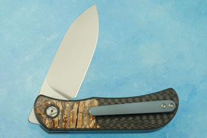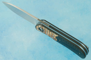 The handle is formed from carbon fiber with precision fit mammoth molar inlays. An integral carbon fiber pivot ring surrounds the pivot. The inlays are flawless with the transition between the two materials being nearly invisible. Blue anodized titanium liners surround the carbon fiber back spacer. The handle is completed with a 3D machined, blue anodized titanium pocket clip mounted for right-handed, tip-up carry.