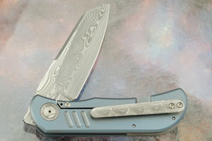 The handle is made from machined Grade 5 titanium and features a handsome blue anodized finish. Trevor's maker mark is engraved into the lockside of the handle. The backbar, pivot collar, and pocket clip are all made from a matching Damasteel. The pocket clip is mounted for right-handed, tip-up carry.