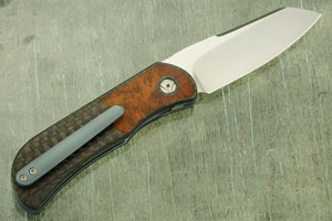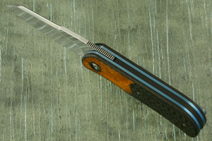 The handle is formed from carbon fiber with precision fit desert ironwood (Olneya tesota) inlays. An integral carbon fiber pivot ring surrounds the custom pivot. The inlays are flawless with the transition between the two materials being nearly invisible. Blue anodized titanium liners surround the carbon fiber back spacer. The handle is completed with a 3D machined, blue anodized titanium pocket clip mounted for right-handed, tip-up carry.