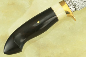 The handle is made from African blackwood matched with a warthog ivory spacer. The contrast between the two materials provides a very elegant look. African blackwood (Dalbergia melanoxylon) is among the densest and hardest woods in the world, making it highly desirable for high end custom knives. A brass bolster completes the handle.