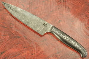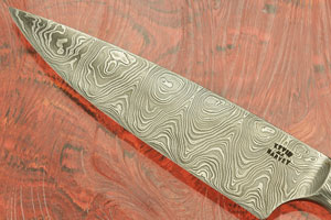 Description: Mastersmith Kevin Harvey began this elegant chef's knife by forging his own ladder pattern damascus to shape. By forging the damascus from carbon steels, Harvey ensures a keen, long lasting edge. This integral chef's knife is a perfect choice for chopping and slicing and is sure to become a favorite in your kitchen.