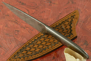 Kevin built a leather sheath for this kitchen knife to protect the edge while being transported.
