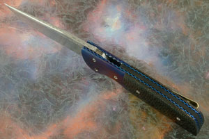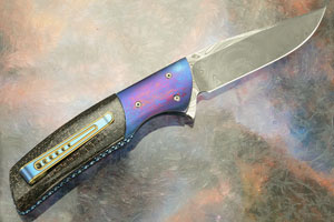 Lightning strike carbon fiber scales rest on grade V titanium liners, keeping this knife as light as it comes. Copper strands move through the carbon fiber weave. This type of carbon fiber was originally designed for use on fighter jets to redirect electricity. Hand fileworked, blue anodized titanium liners and a carbon fiber backbar keep the knife light and strong. An elevated, jimped thumb ramp provides for a secure thumb purchase. Even the flipper toggle has jimping to ensure it flips open with ease every time. The bolsters are formed from titanium damascus. Alternating layers of different grades of titanium are forged together into a beautiful, fine, non-ferrous damascus. The differentially anodized, deep carry titanium pocket clip is mounted for right-handed, tip up carry.