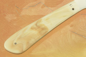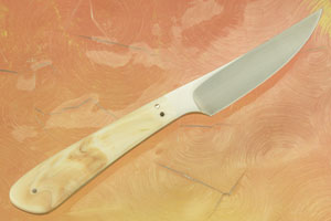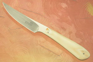 Warthog tusk handle scales are set to the full tang using stainless steel pins. The knife is very lightweight (just over 2 oz!) and comfortable to hold, making it perfect for a daily carry fixed blade. From caping fowl and fish to use as a EDC, this bird & trout knife will be a tremendous piece out in the field.