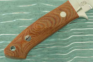 Natural Micarta scales are set on the distal tapered full tang for strength and durability. Red vulcanized fiber spacers add a nice contrast. The handle is perfectly contoured for a secure, comfortable grip that you won't want to put down. The handle is completed with two Corby bolts and a steel lined lanyard hole. The 303 stainless steel cross guard helps your hand not slip forward onto the blade.