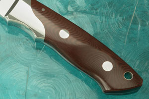 Maroon Micarta scales are set on the distal tapered full tang for strength and durability. Red vulcanized fiber spacers add a nice contrast. The handle is perfectly contoured for a secure, comfortable grip that you won't want to put down. The handle is completed with two hidden bolt rivets and a steel lined lanyard hole. The 304 stainless steel guard meets with the handle scales in an elegant, perfectly performed S-curve.