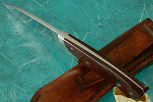 Description: The Loveless style Drop Point Hunter is perhaps the quintessential hunting knife throughout the world. Loveless developed a hunting knife shape that just works exceptionally well. This Deon Nel S-Bolster Drop Point Hunter is no different. It shows off Nel's work at its best.