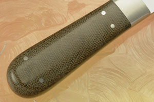 Green Micarta scales are set on the distal tapered full tang for strength and durability. The handle is perfectly contoured for a secure, comfortable grip that you won't want to put down. It is completed with four stainless steel pins. The 304 stainless steel guard meets perfectly to the Micarta handle scales.