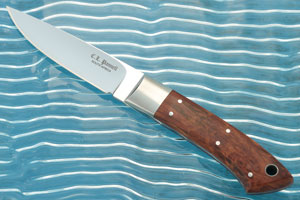 Handle scales are broom karee wood (Searsia erosa), secured to the distal tapered full tang using stainless steel pins. Broom karee is a shrub native to Botswana, South Africa, and Lesotho. The warm toned wood has a dramatic, convoluted figure. The scales meet perfectly with 304 stainless steel bolsters.