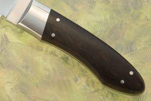 Red bushwillow handle scales are set on the full tang for strength and durability. South African red bushwillow (Combretum apiculatum) has great figure and a nice dark tone. The scales are perfectly fit to polished stainless steel bolsters. The contoured handle fills your hand nicely and provides a comfortable grip.