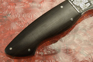 The handle is formed from African blackwood, set on the distal tapered full tang for strength and durability. Ensuring a perfect fit, the handle scales are dovetailed to stainless steel bolsters. Neels hand engraved the bolsters, representing images of Itzamna. Itzamna was, in Maya mythology, the name of an upper god and creator deity thought to reside in the sky. He was the god of fire who created the Earth. The Mayan believed he gave them the calendar and writing. He is believed to be the ruler of heaven as well as day and night. The Mayan-inspired engraving is beautifully done.