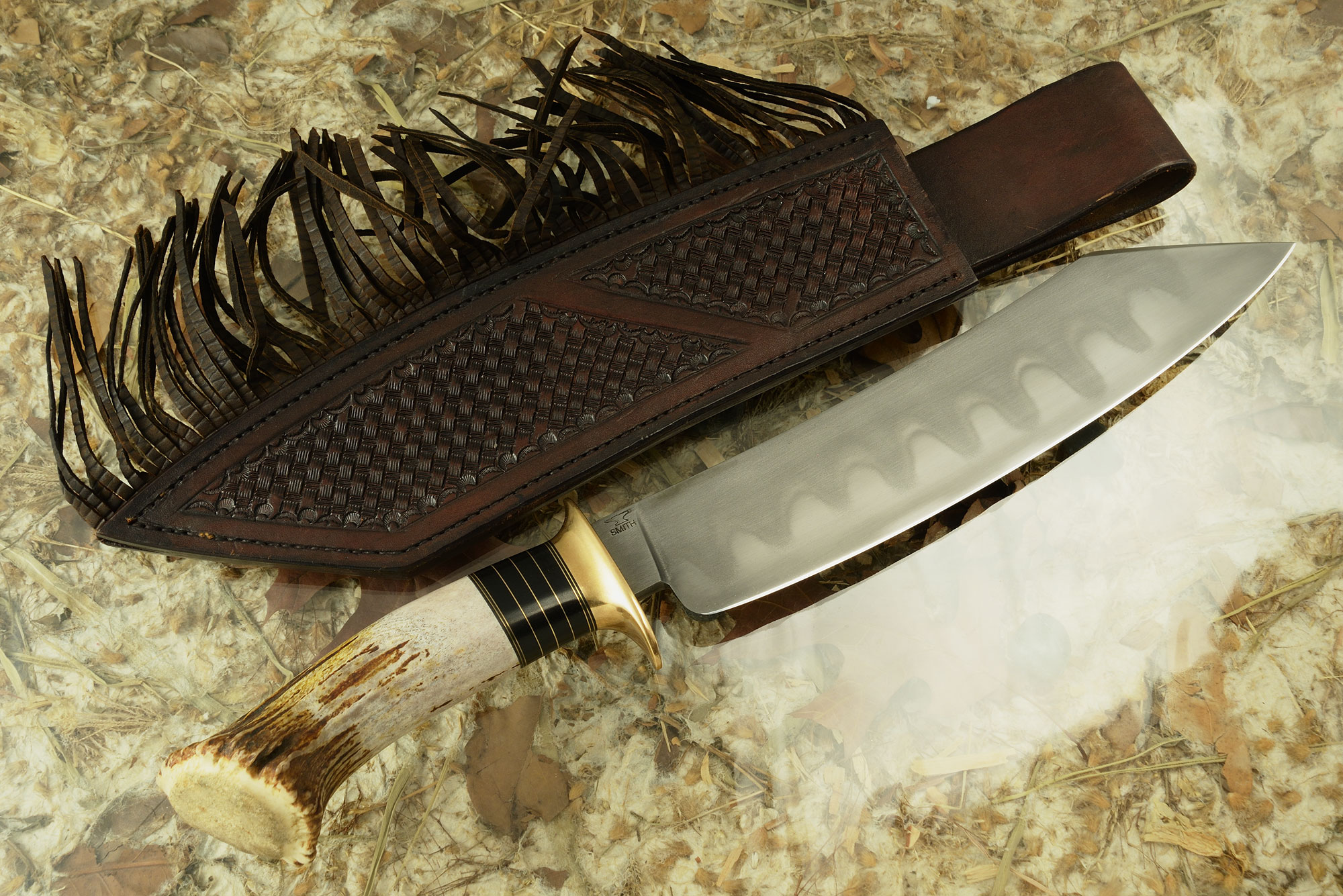The handle is formed from a large section of moose antler. The natural texturing around the crown of the horn offers plenty of tactile grip. Alternating African blackwood and bronze spacers add nice contrast to the light toned horn. A polished bronze guard helps bring the weight forward in the knife and will prevent your hand from slipping over the blade during heavy use.