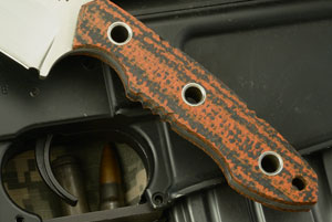 The handle is made from orange and black burlap Micarta secured to a full tang for strength and durability. The large choil accomadates many grip styles adding versatility. A lanyard can be added to the back of the knife if desired.