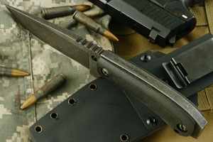 Handle scales are made from black Micarta. An included tool stored in the sheath allows the scale screws to be removed to access the inside of the tang. In addition to acting as a screwdriver, the tool culminates in a thick flat end that can be used for hammering and striking. A lanyard can be added if more retention is desired.