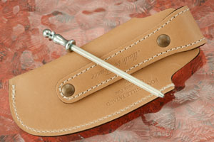 Description: This brown leather belt pouch is made in France by Fontenille Pataud, renowned Laguiole knifemaker. The belt pouch is accompanied by a metal honing rod to keep your blades razor sharp. The sewing and the leather are an excellent quality. This will protect your knives either in your pocket or your belt.