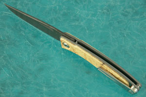Handle: Box elder burl scales inlaid into a 6Al4V titanium frame