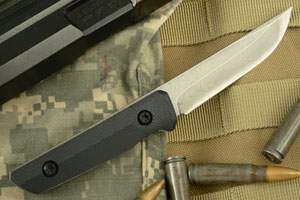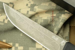 Blade: OUS san mai - OU-31 at the core, surrounded by stainless steel with a non-reflective disruptive acid finish