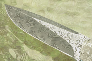 The hollow ground blade is formed from damascus forged by Damasteel in Sweden. The blade has smooth, drop shut action and is easily opened with one hand using the ambidextrous flipper toggle. It uses the IKBS (Ikoma Korth Bearing System) pivot system. This mechanism, which was originally designed to fit balisong knives, uses ball bearings to create exceptional action with no blade play. This special folder is made with ceramic ball bearings. Generally IKBS bearings are made either from tool steel or from stainless steel. Stainless steel can wear away, resulting in uneven action over time. Tool steel bearings can oxidize making the action rough. Ceramic bearings are the best of all worlds -- extremely hard and wear resistant, they are also inert and will not oxidize.