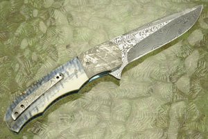Description: South African knifemaker George Muller makes an exceptionally dramatic knife -- and at a price that would never be found from a US maker. Visiting with Muller during my trips to South Africa is always a highlight. The colors, textures and style all work perfectly together. The combination of ancient mammoth ivory, stainless damascus, and Gibeon meteorite immediately captures the eye and inspires the imagination.