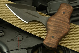 Maple scales are set on a full tang. The rounded handle sits comfortably in your palm with the blade protruding from between the second and third fingers. This provides a sure, comfortable grip with a heck of a wallop. The 80CRV2 carbon steel blade has 1-3/4 inch cutting edges and measures 2-2/3 inches from tip to the handle. The blade has a non-glare Caswell finish.