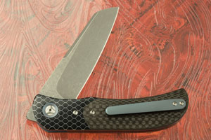 The handle is formed from carbon fiber perfectly fit to green C-Tek resin infused aluminum honeycomb bolsters. C-Tek is a material that has been "in the works" since 1995. The material is absolutely stunning in its appearance and its ability to reflect light and gives a whole new depth to the knife making art. Blue anodized titanium pivot collars are inlaid into the bolsters. Blue anodized titanium liners surround the carbon fiber back spacer. The handle is completed with a 3D machined, blue anodized titanium pocket clip mounted for right-handed, tip-up carry.