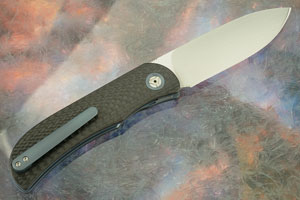 Carbon fiber scales keep the knife light and fast. Blue anodized titanium liners surround a carbon fiber backbar. Blue anodized titanium pivot collars are inlaid into the scales. A machine textured and blue anodized titanium pocket clip is mounted for right-handed, tip-up carry.