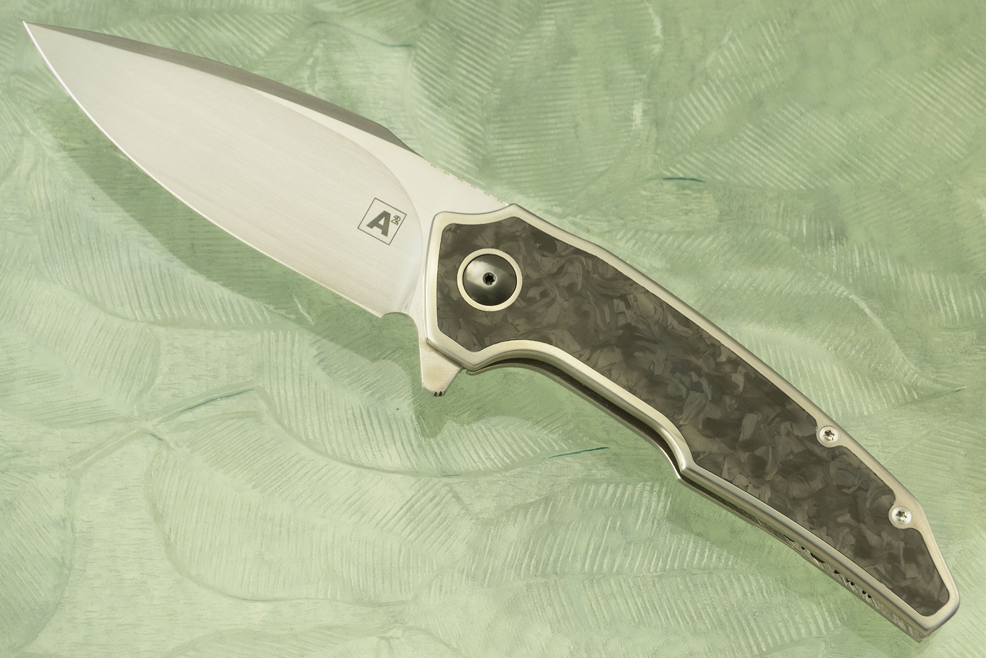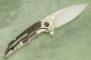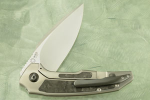 The handle frame is formed from titanium meticulously inlaid with marble carbon fiber. The inlays are flawless -- with the transition between the materials being nearly invisible. Jimping on the thumb ramp aids grip. The low profile handle feels sturdy and will carry in the pocket exceptionally well. The pivot is made from solid zirconium and features an integral titanium pivot collar on the show side. The heat colored zirconium pocket clip is mounted for tip-up, right-handed carry.