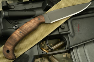 Maple scales sit on the full tang for strength and durability. The handle is downturned to make it incredibly easy to pull from the sheath during concealed carry. The spine features the Winkler Knives touchmark.