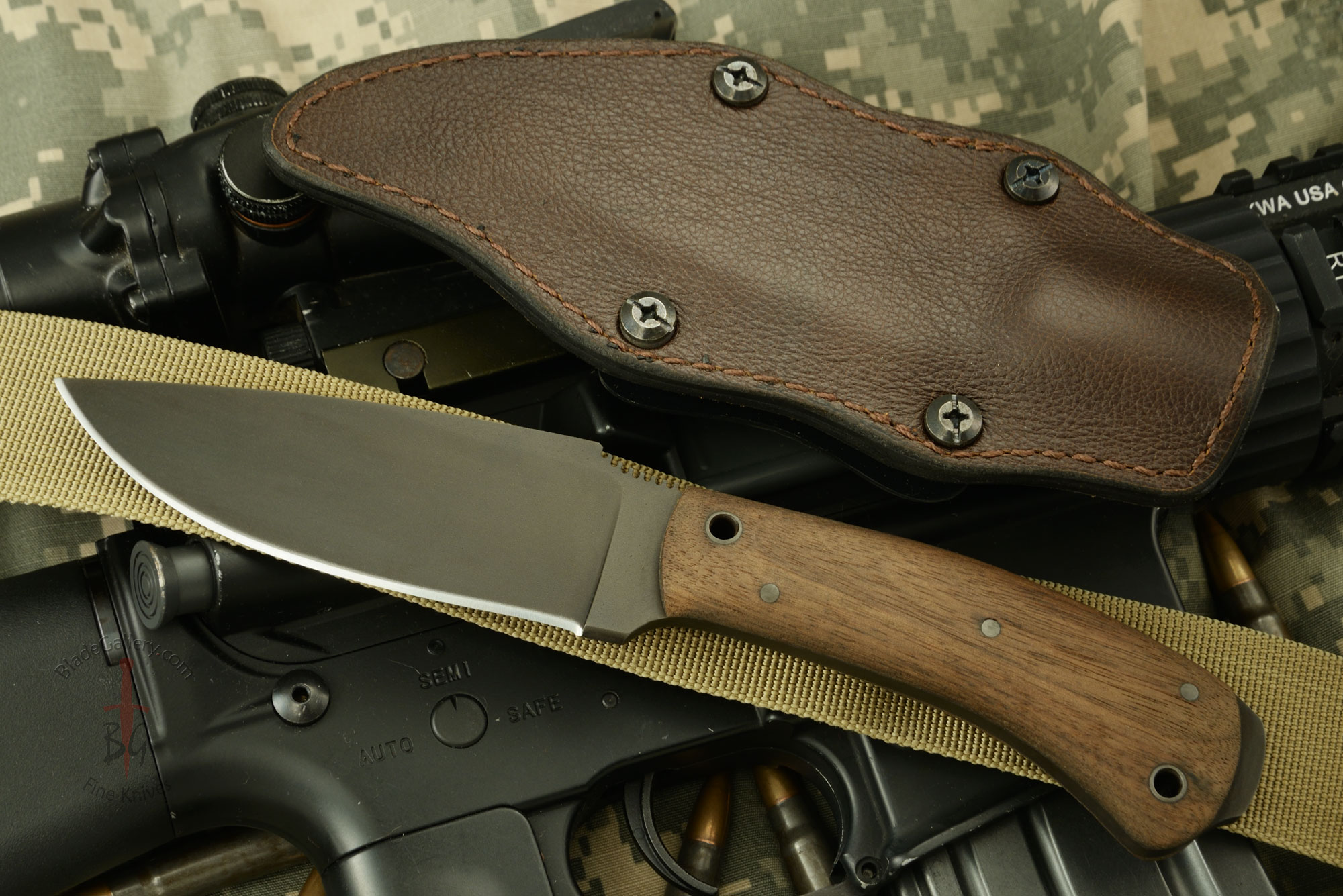ABS Master Bladesmith Daniel Winkler introduced the Woodsman at the 2017 Blade Show. It is a tremendous, high performing EDC utility. The blade is formed from 3/16" 80CrV2 carbon steel with a non-glare Caswell finish. A full tang ensures strength and durability. The tang extends past the end of the walnut wood handle, allowing it to be used as an effective glass breaker. Daniel moved the thumb rest a little higher on the blade for close in carving work. Two lanyard holes allow the easy addition of a paracord lanyard for extra retention in hand.