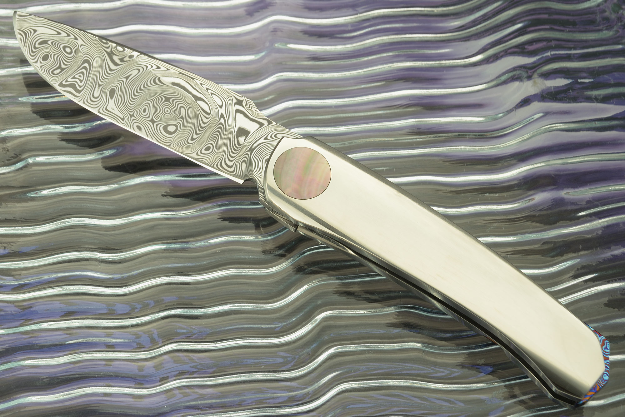 The stonewash polished 6Al-4V titanium handle has a sturdy framelock for a strong lockup. Blacklip mother of pearl is inlaid into the left scale. The backbar, pivot collar, and pocket clip are all made from heat colored Timascus titanium damascus. The pocket clip is mounted for right-handed, tip-up carry.