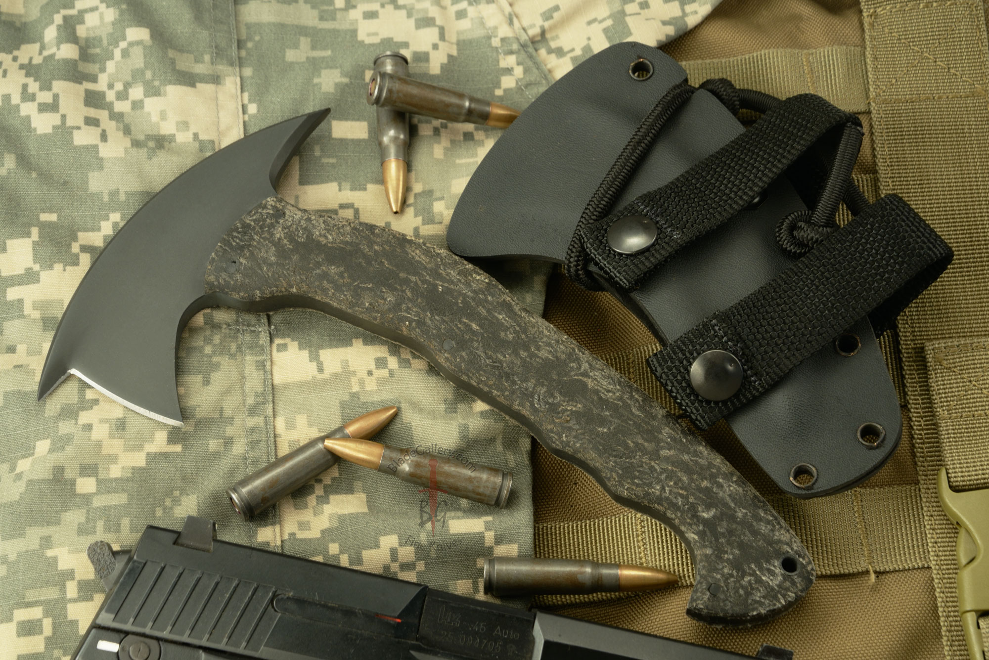 An upward curved end provides a reinforce grip. The haft is formed from durable rubber set on a distal tapered full tang. The Caswell black oxide provides a non-reflective finish.