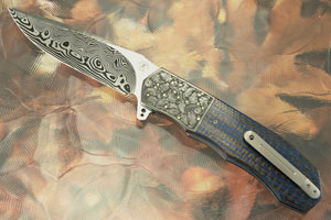 L44 Flipper with Damascus, Blue Lightning Strike Carbon Fiber, and Engraved Zirconium with Gold Inlay (Ceramic IKBS) - LEFT HANDED!!
