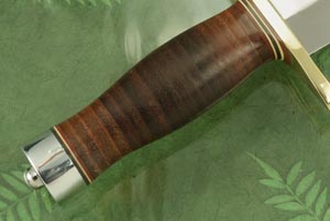 The handle is formed from stacked leather. The large guard is formed from polished brass and the butt cap is made from duralumin. Red, white, and blue fiber spacers add contrast between the fittings and the handle.