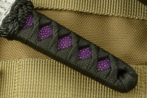 Handle: Japanese-style epoxy soaked nylon flatcord wrapped over black rayskin