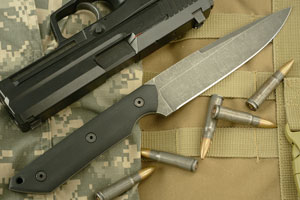 The handle is made from black G-10 set to a full tang using removable allen wrench screws. The contoured handle is comfortable in the hand and offers an excellent grip. If extra retention is desired, a lanyard can be added to the back of the knife.