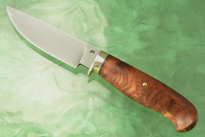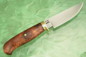 Stuart hand forged the drop point blade from 52100 carbon steel. This high performing steel is considered to be among the best steels (if not the very best) by many knifemakers and knife users. Makers such as Mastersmiths Bill Burke, Bob Kramer, and Ed Fowler have pioneered this long edge holding steel. It features an heirloom quality hand rubbed satin finish and is distal tapered, ensuring perfect balance.