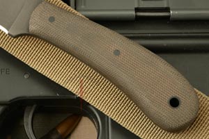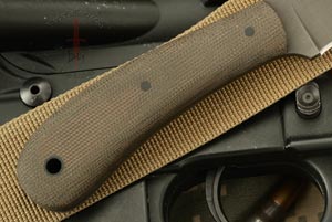 Handle: Green Micarta set on a distal tapered full tang