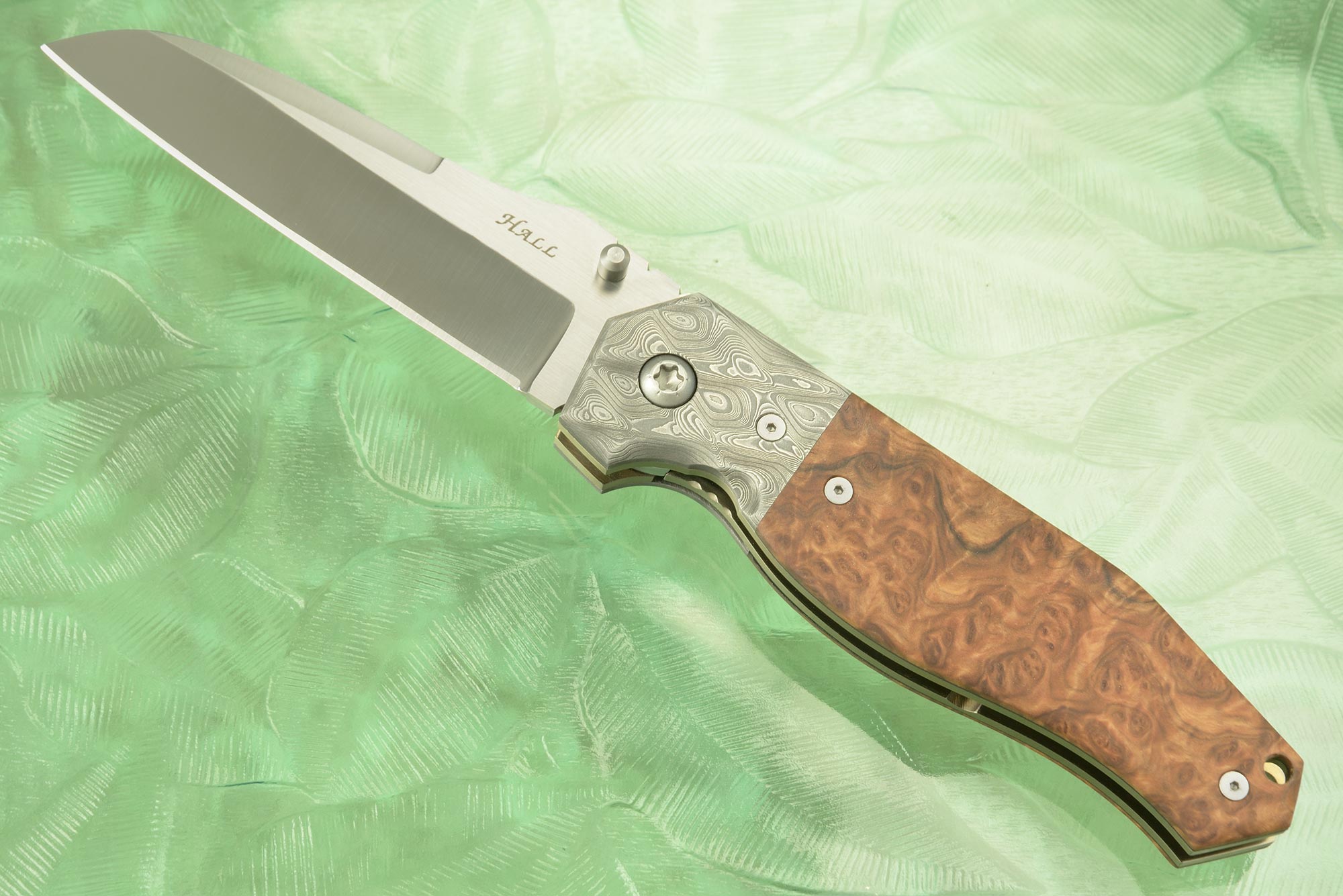 The handle scales are formed from Australian York gum burl (Eucalyptus loxophleba). The wooden scales, with their convoluted grain, are exceptionally beautiful. They fit perfectly to dark etched Damasteel stainless damascus bolsters. Bronze anodized titanium liners surround a carbon fiber backbar. A lanyard can be added to the back of the knife for extra retention. The stonewashed titanium pocket clip is mounted for right-side, tip-up carry.
